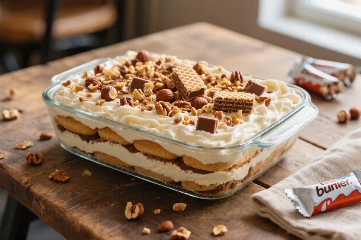 En verrines, l’effet visuel noir/blanc-noisette est irrésistible. Superposez: crème Kinder (plus foncée), boudoir imbibé, éclats de Kinder Bueno, puis crème nature sur le dessus pour un contraste net. Finition au cacao non sucré tamisé, mini copeaux de chocolat, et un petit morceau de Kinder Bueno en “totem” pour le clin d’œil.